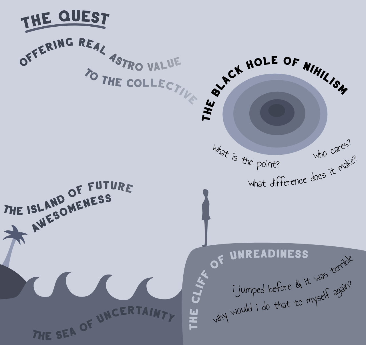 Nihilism is just the shape my exhaustion takes…I don’t take it too seriously at this point because I’m quite familiar with it. I know what it means and I know what it is there for. It exists to keep me from leaping because I need time to heal. It protects me from what I’m not yet ready to take on.